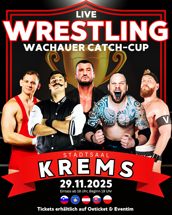 EWA WACHAUER CATCH-CUP 2025 Nach 30 Jahren kehrt das Wrestling zurück nach Krems! Am 29. November 2025 wird der Stadtsaal Krems zur Arena, wenn sechs internationale Superstars um den legendären Catch-Cup kämpfen! Stadtsaal Krems, NÖ Wrestling ist Entertainment für die ganze Familie – sei dabei, wenn Geschichte geschrieben wird! | |